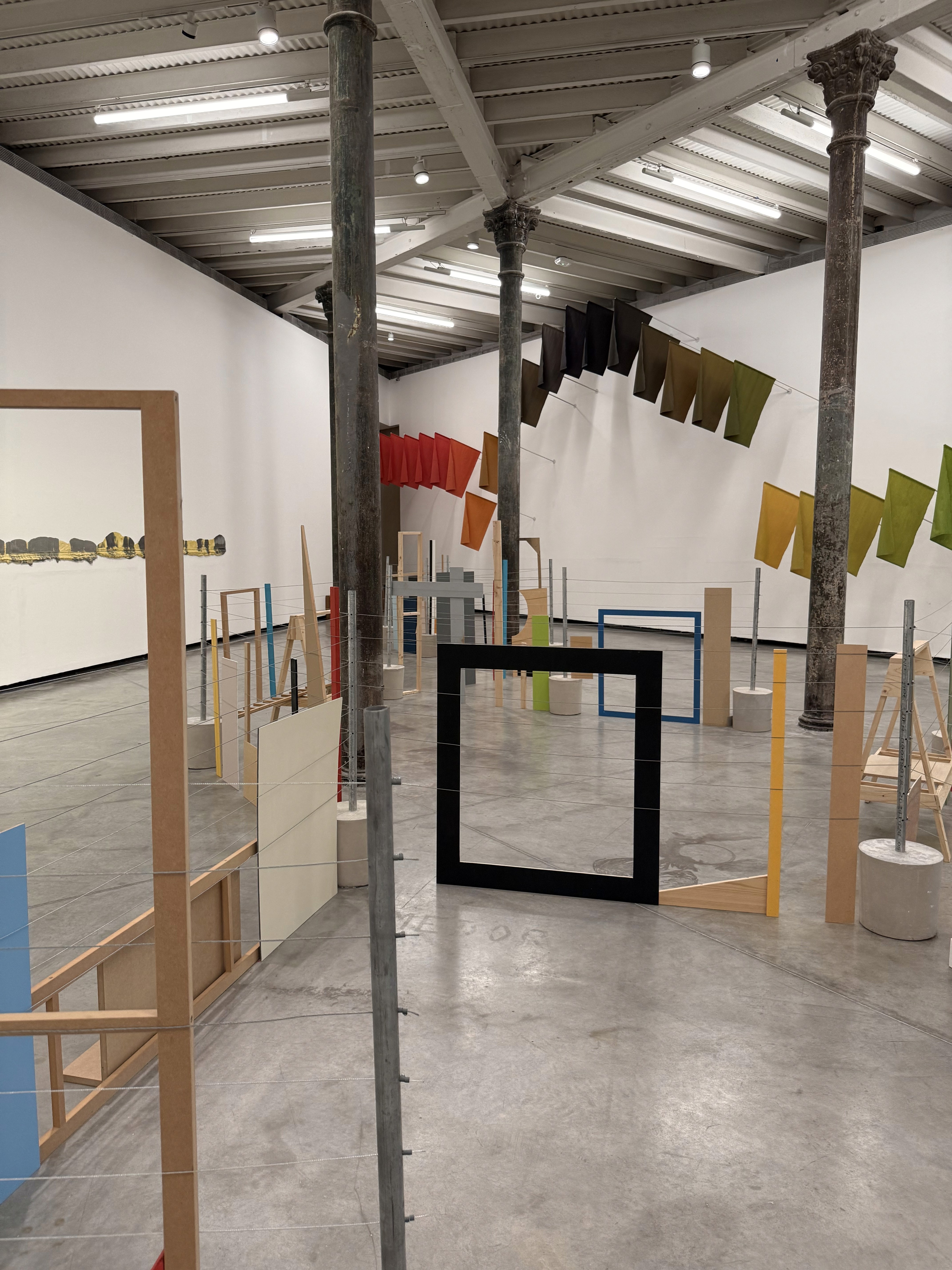 Neuenschwander arma una señalética improvisada que modela la circulación sin terminar de imponerla. Sus barreras son cercas que deberían proteger pero terminan dibujando una coreografía ambigua. Marcan un camino y, a la vez, lo vuelven discutible. Pica, en cambio, convierte el deseo de saber en una escena casi ridícula y por eso eficaz. Los vasos multiplicados contra la pared prometen acceso a una información secreta, pero lo que devuelven suele ser el ruido del entorno o tu propio susurro. La escucha aparece como fantasía de control y como fracaso estructural. Dahn, con la marca de yeso y pigmento sobre el muro, te baja del plano de la metáfora a la evidencia física. La arquitectura queda como archivo del gesto y del cuerpo, una superficie que registra tensión, gravedad, memoria, como si el edificio hubiera sido tocado y eso no se pudiera borrar del todo. Odriozola completa el circuito con una fila de banderas hechas de papel de cocina pintado a mano. Repite, acumula, insiste. La identidad entra como diseño y sale como doméstico. El símbolo se vuelve frágil, absorbente, literal.