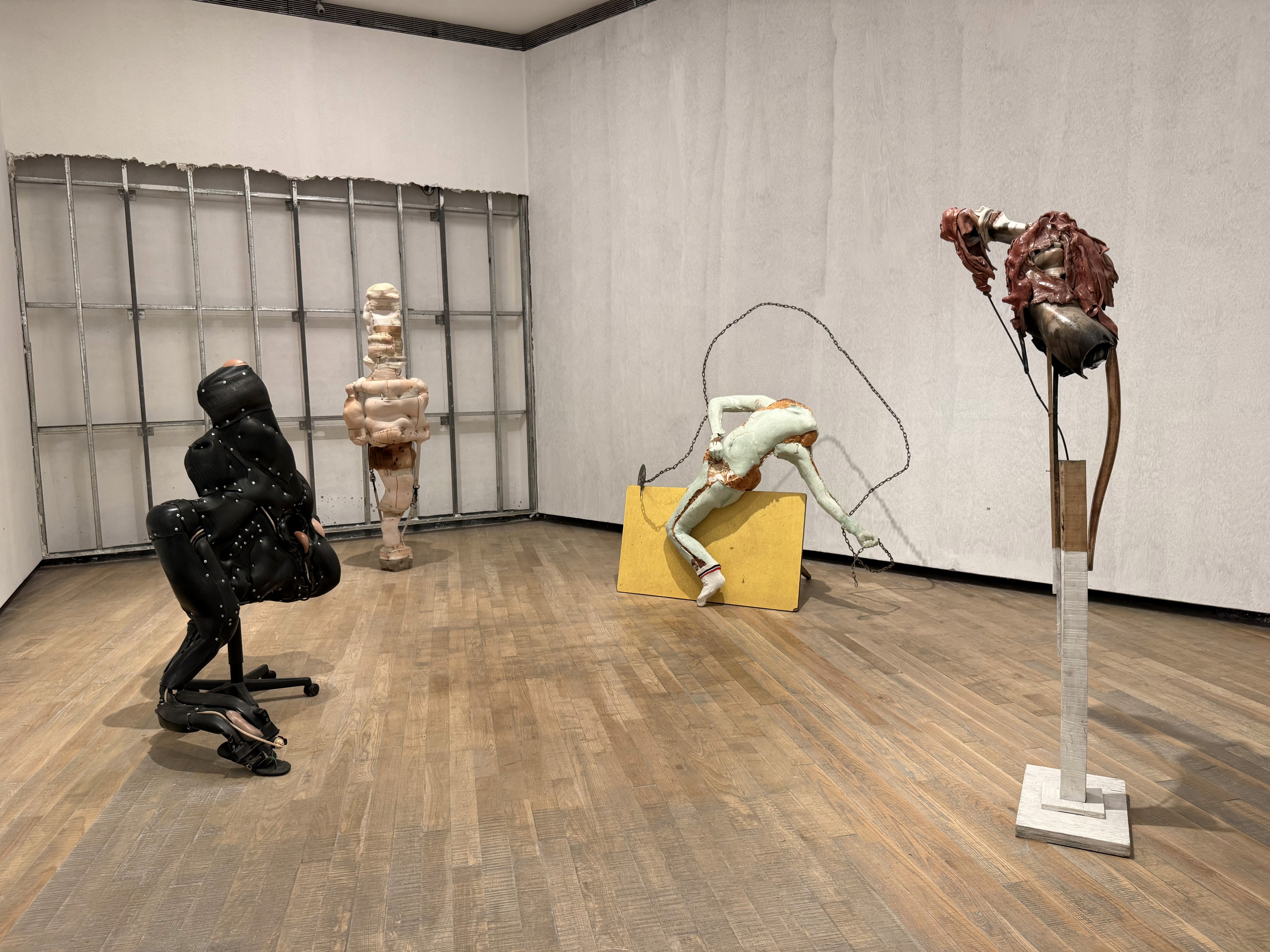 Bianchi hace que esa fisiología se vuelva sistema. En Anabolismo y Caleidoscopio el cuerpo aparece como máquina y residuo al mismo tiempo, como si todo lo vital estuviera ya atravesado por la lógica del descarte. En Lying Down Muscled la musculatura es un injerto que no promete salvación, promete dependencia. Un tanque de combustible recubierto de epoxi sostiene fragmentos de maniquí y una silla de ruedas. Cuerpo, prótesis y maquinaria quedan en la misma frase, como si la fuerza ya viniera agotada de fábrica.