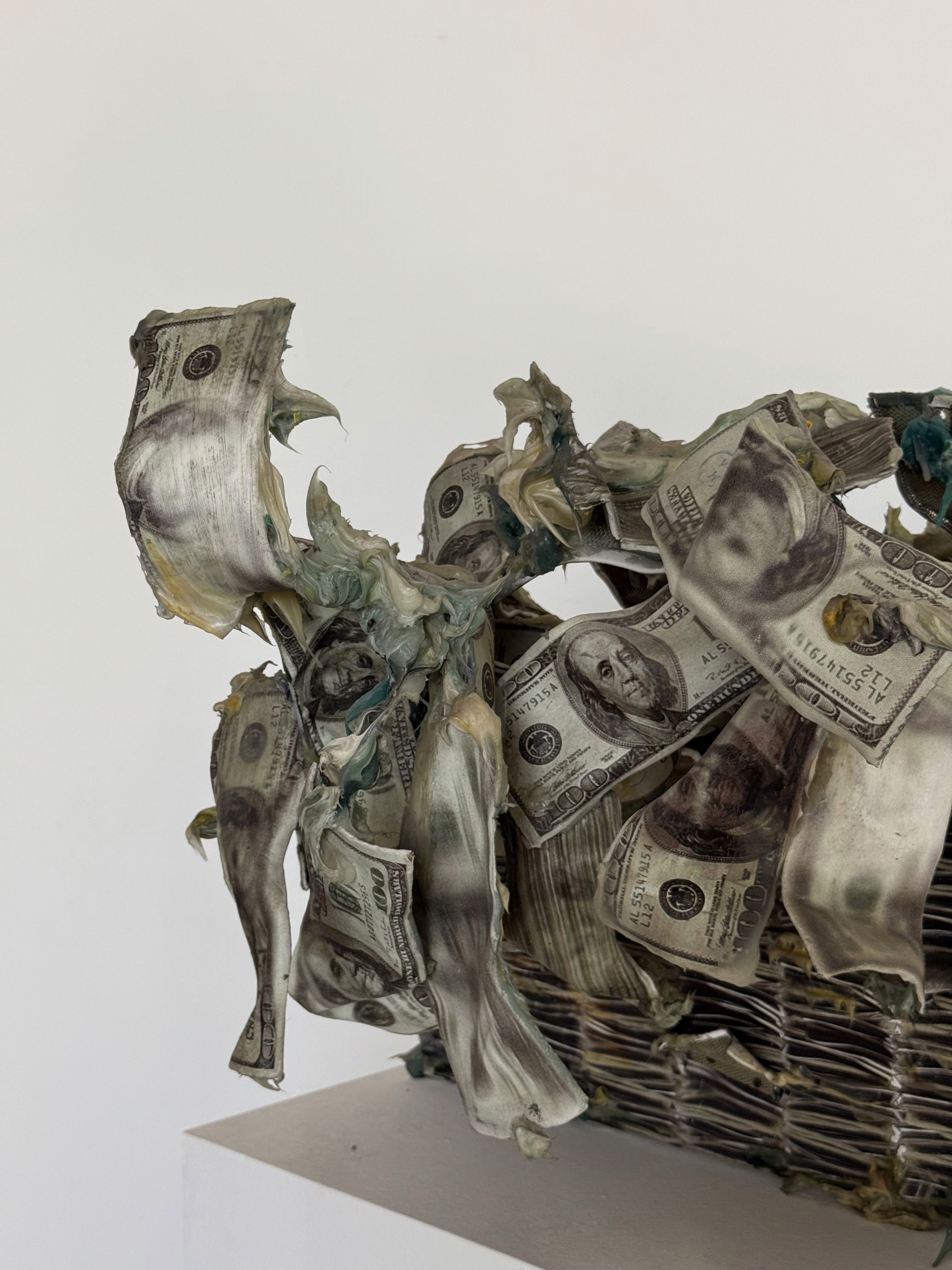 Lo eficaz de la obra está en la literalidad bien usada. El dólar, ese símbolo que pretende estabilidad, aparece como cuerpo que se deshace. En vez de seguridad, viscosidad. En vez de orden, colapso material. Es una inversión simple, pero no simplona, porque el dólar en Argentina siempre tuvo una doble vida, promesa de estabilidad y síntoma de crisis. Marcaccio lo materializa como lo que muchas veces fue: una estabilidad que solo se sostiene a fuerza de deseo y de paranoia.