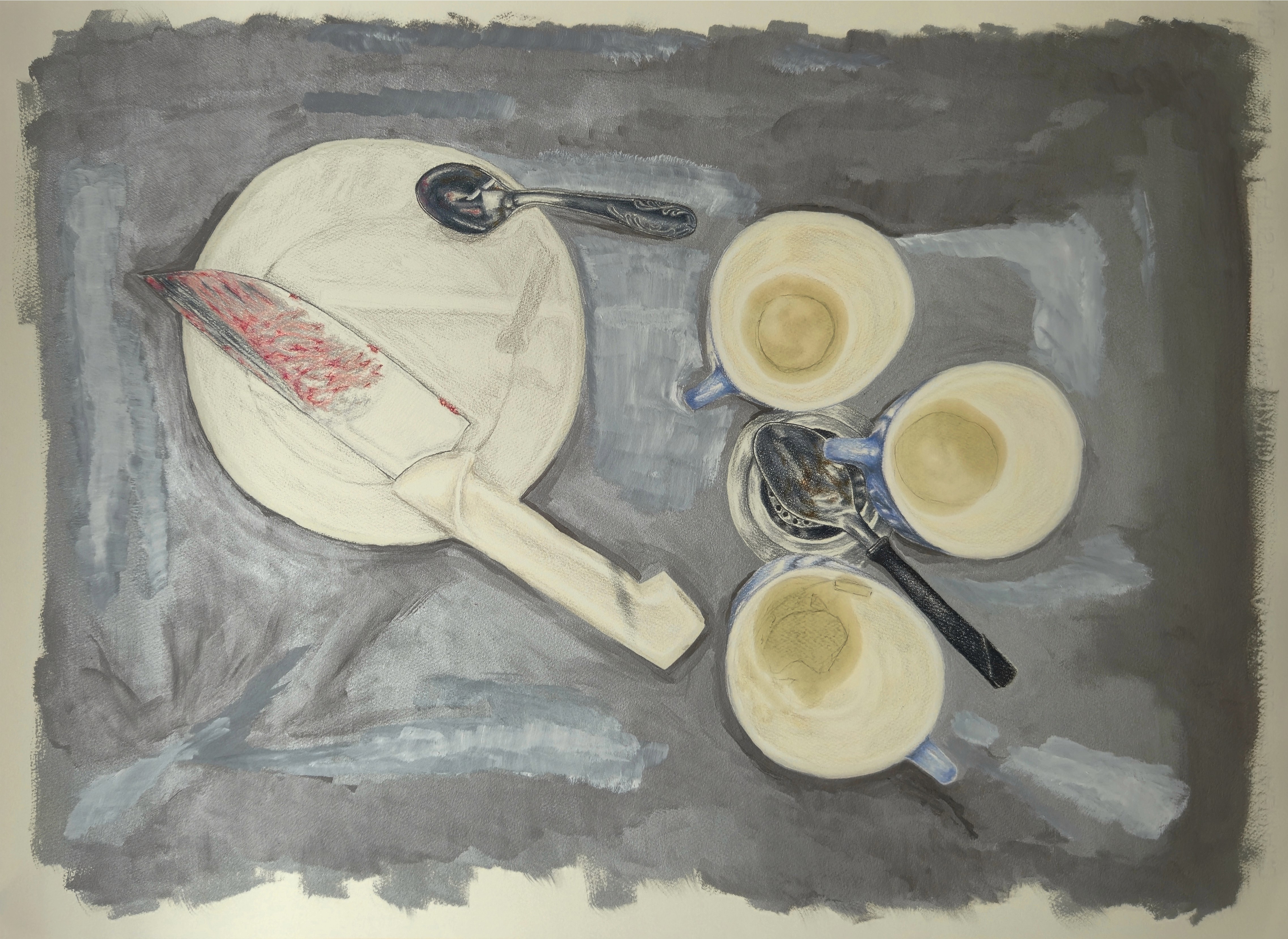 En paralelo, Mauricio desarrolla una línea de trabajos centrados en lo doméstico: cocinas, hornallas, bachas, mesas después de un almuerzo entre amigos. En Enzo, Emi y yo después del postre de cumpleaños, una vista cenital muestra tazas usadas, cucharitas, un plato y un cuchillo con restos de algo rojo que ya no se ve pero se intuye. Es una escena mínima, casi neutra, pero cargada de pos-acontecimiento: el momento después del festejo, cuando lo importante ya pasó y solo quedan los rastros. En otras obras, la hornalla gastada, las manchas en el metal y las sombras de la mesada se vuelven un mapa afectivo tanto como un ejercicio de dibujo.